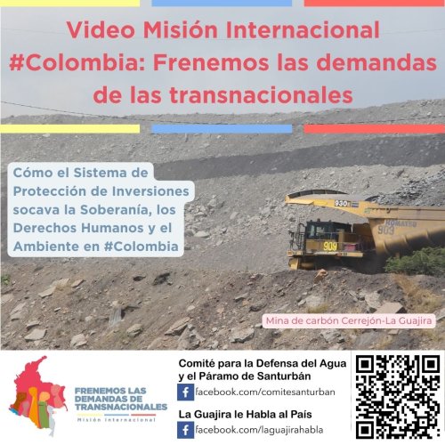 La Misión Internacional #FrenemosLasDemandasDeTransnacionales lanza el vídeo de su experiencia en Colombia el año 2023, en rechazo al abuso de poder de las empresas transnacionales a través de demandas multimillonarias en contra del país latinoamericano, y haciendo un llamado a la administración de Gustavo Petro y Francia Márquez a retirarse del sistema injusto de protección de inversiones extranjeras. La Misión, con representación de organizaciones sociales y ambientales de 8 países de las Américas y Europa, visitó el país entre el 22 de mayo y el 1 de junio de 2023, para intercambiar experiencias de acción contra el Sistema de Solución de Controversias Inversionista-Estado (SCIE o ISDS por sus siglas en inglés) que permite demandas multimillonarias de empresas transnacionales en contra de países soberanos en tribunales supranacionales de arbitraje.
