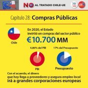 El capítulo de Compras Públicas (Contratación Pública) tiene como objetivo abrir las compras públicas a proveedores de las Partes, esto es: empresas de Chile y la Unión Europea. Este capítulo compromete a las Partes a que sus entidades de contratación brindarán un trato no discriminatorio a los operadores económicos, bienes y servicios de ambas Partes sobre la base de normas sustantivas que aplican los principios de no discriminación y transparencia.